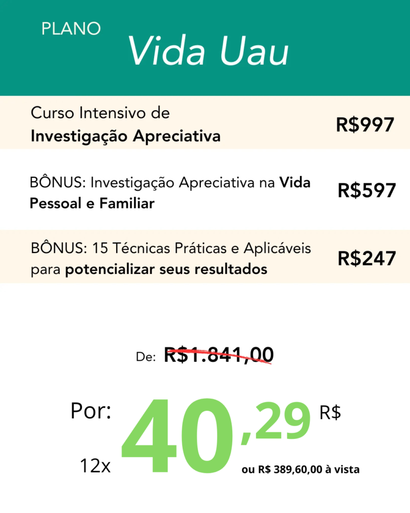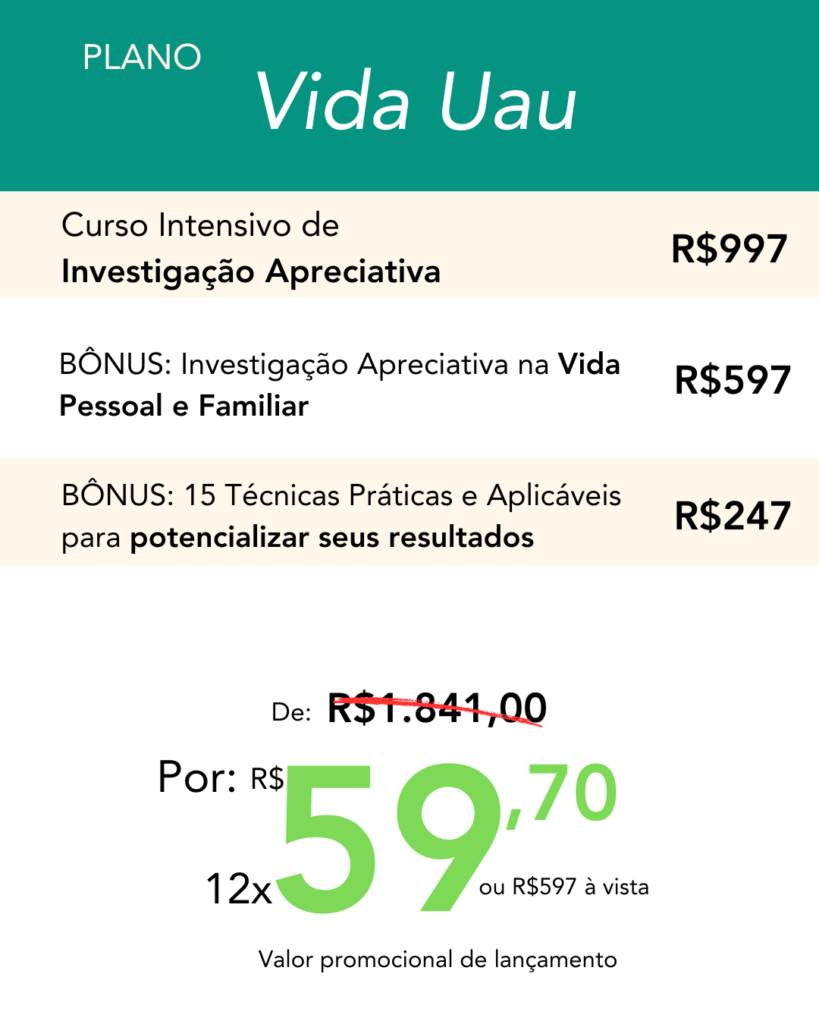 O Curso Intensivo de Investigação Apreciativa poderia valer milhares de reais apenas pela transformação que pode trazer pra sua vida e tanto no seu círculo familiar, quanto no seu ambiente profissional.